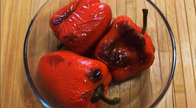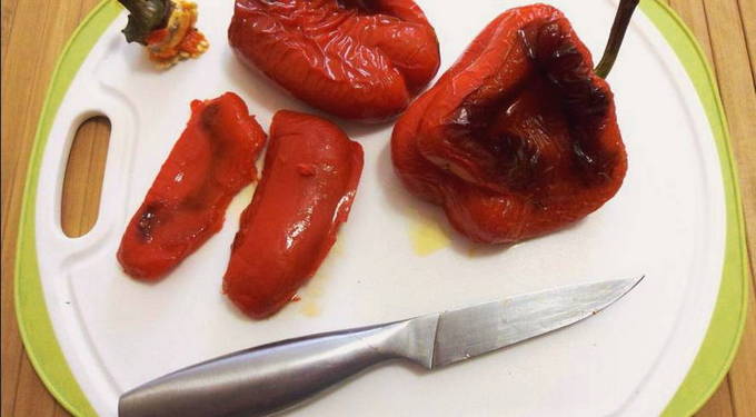 - Haal de paprika's uit de oven en laat ze onder het deksel afkoelen tot kamertemperatuur.