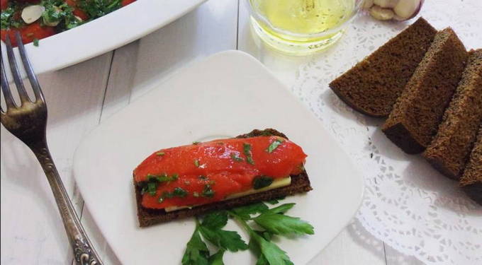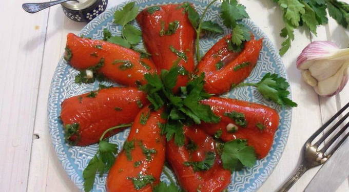 Het kost niet veel tijd en moeite om een geurig tussendoortje te bereiden - gebakken zoete paprika's in een saus van olijfolie, knoflook en kruiden. Dit gerecht gaat goed samen met gebakken vis, kebab en zelfs zwart brood!