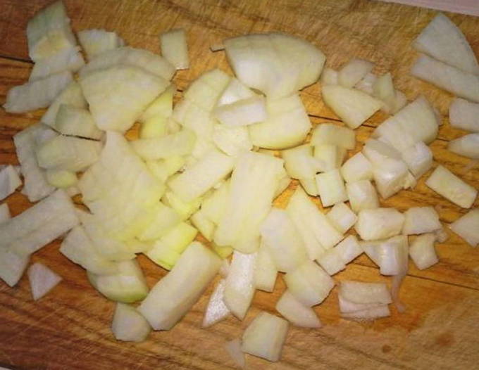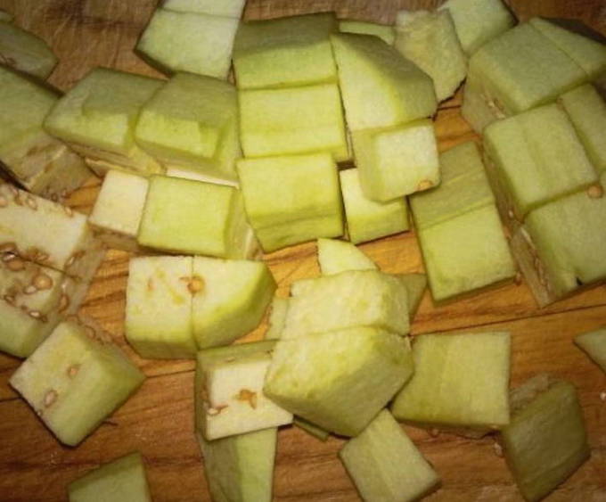 - Schil de aubergine en snijd hem in kleine blokjes.