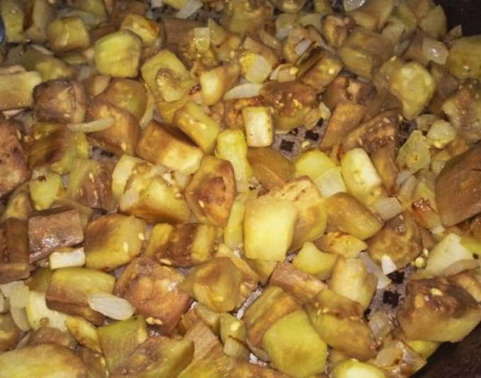 - Bak aubergines in plantaardige olie met uien tot ze zacht zijn.