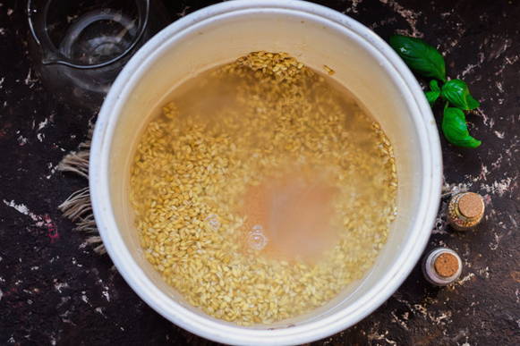 - We laten het graan ongeveer 2-4 uur weken, waarna we het spoelen en op een zeef leggen.