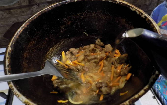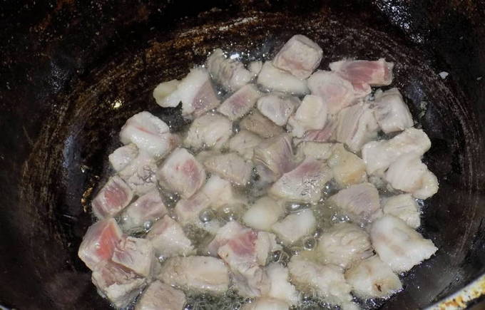 - Bak de stukken vlees in plantaardige olie ongeveer 5-7 minuten.