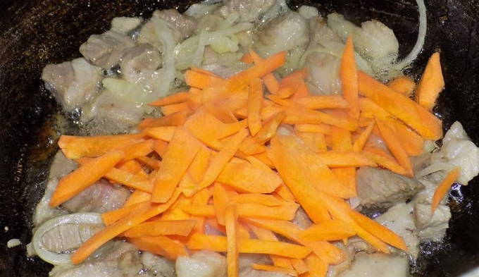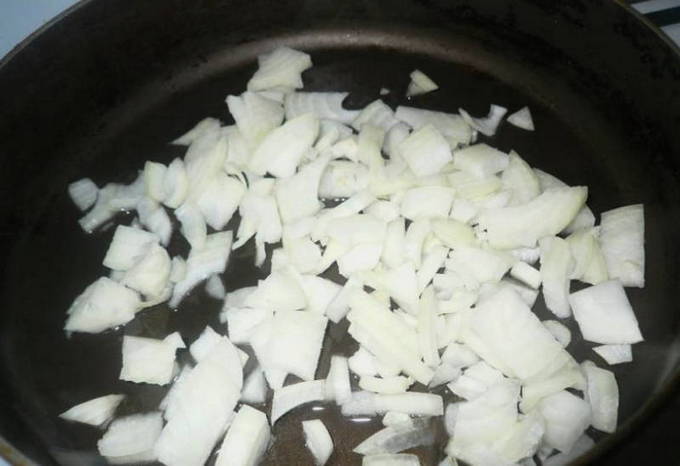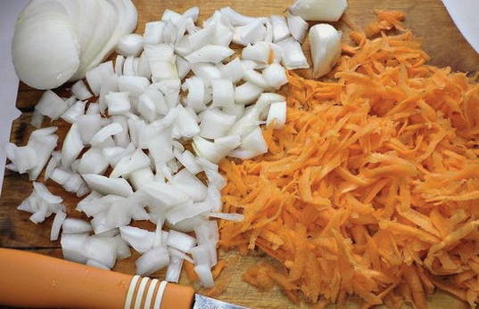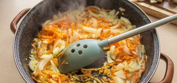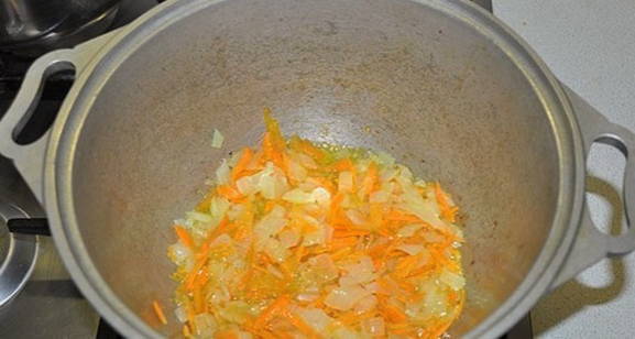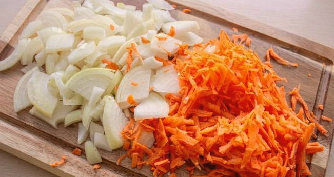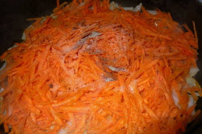 - Snipper de uien en wrijf de wortelen. Bak groenten ongeveer 3-5 minuten in plantaardige olie.