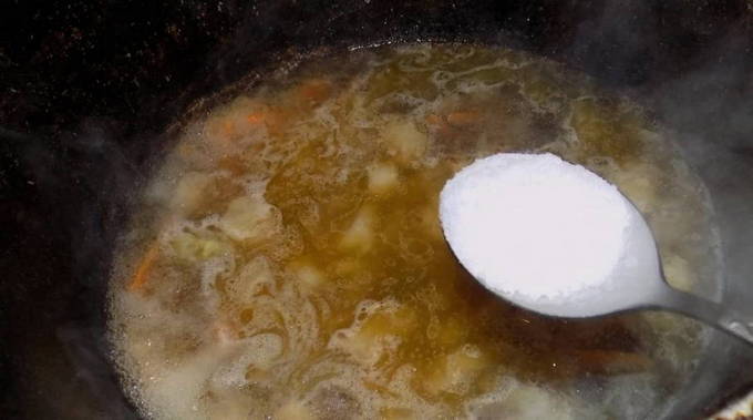 - Voeg 5 minuten voor het koken zout toe en meng de inhoud voorzichtig.