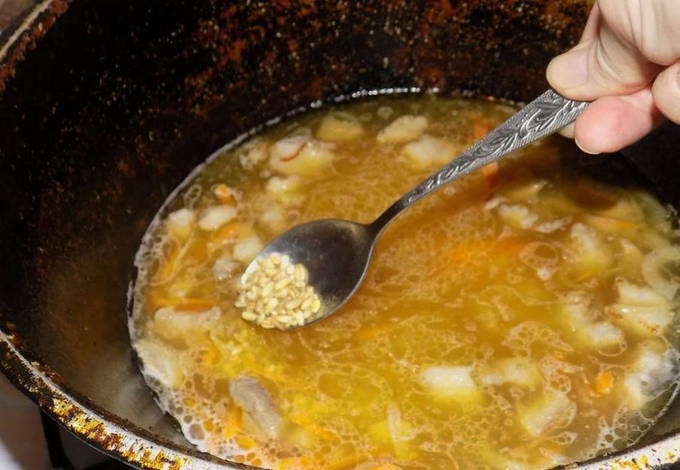 - Roer de grutten met groentebak. Zout en bestrooi de bereiding met kruiden. Doe het in een pot en vul het met water.
