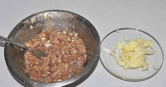 - Haal de stoofpot uit het blik en kneed het met een vork. Stukjes vet kunnen worden verwijderd.