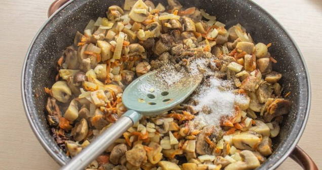 - We verspreiden geraspte wortelen naar de ui. Bestrooi het geheel met zout en zwarte peper. Roer en bak 5-7 minuten.
