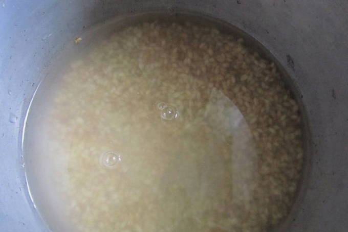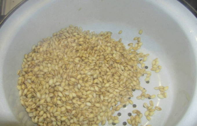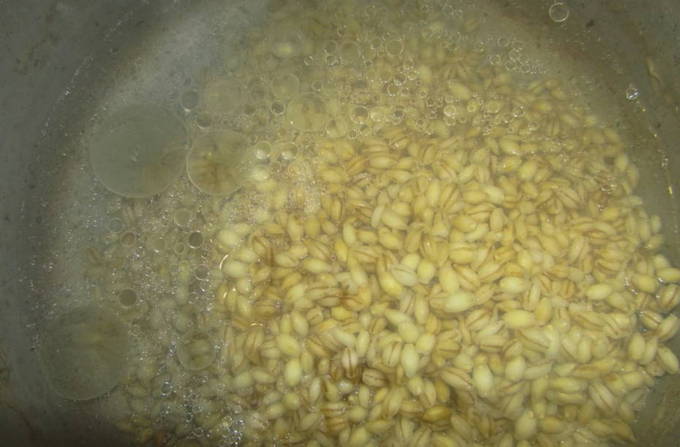- Vul het graan met warm water en spoel het af. Drijvende granen moeten worden weggegooid.