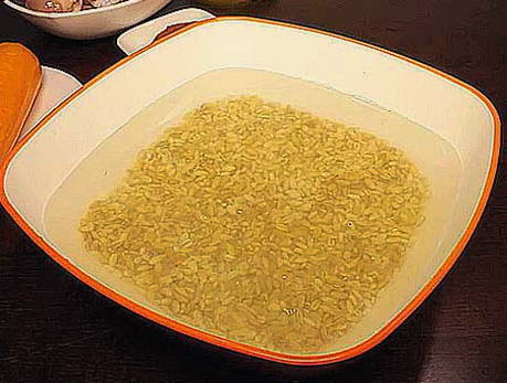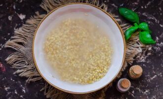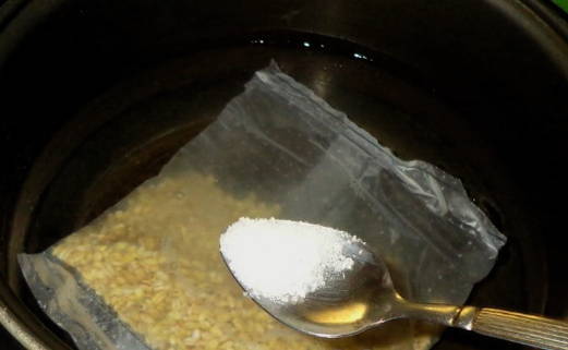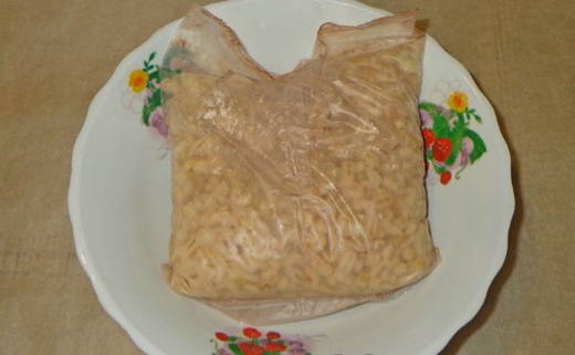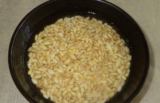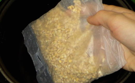 - We laten de zak Alkmaarse gort in warm water zakken, zodat het water het graan volledig bedekt.