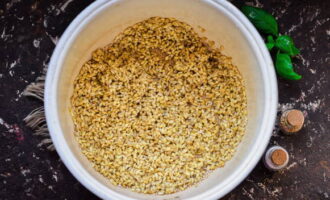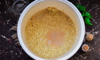 - Doe na 10 minuten de Alkmaarse gort in de kom van de multikoker en vul deze met heet water. Voeg zout en kruiden toe, meng en laat, afgedekt met een deksel, koken.