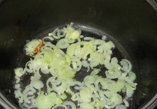 - Giet plantaardige olie in de multicooker-kom en verwarm deze in de "Fry" -modus, en bak de ui er ongeveer 4 minuten op.