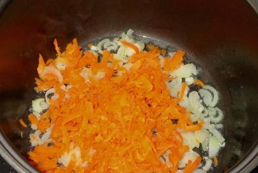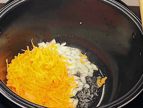 - Giet plantaardige olie in de multikoker, doe er uien en wortels in. We selecteren de modus "Fry" en bakken de groenten.