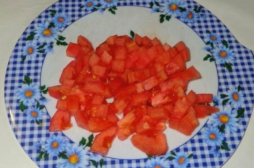 - Verwijder de schil van de tomaat en snijd deze in kleine blokjes.
