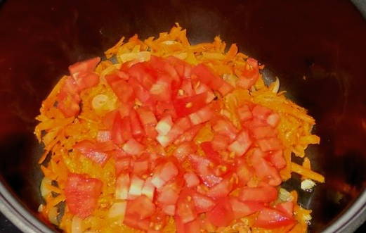 - Giet de tomaten in de multikoker, meng ze met de rest van de groenten en bak ze 2 minuten. Schakel de modus "Fry" uit.