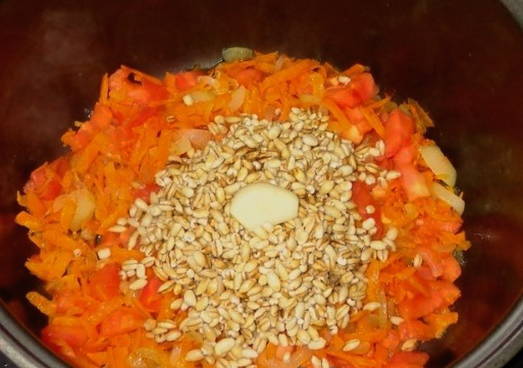 Gerst gekookt in een slowcooker stoomt goed en blijkt erg mals te zijn.De smaak van pap wordt vakkundig aangevuld door uien en wortelen, en verse tomaten geven het een mooie en heldere kleur. Dit gerecht is een uitstekend bijgerecht voor vlees of vis.