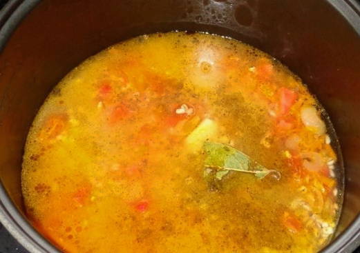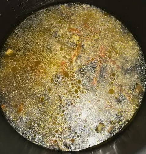 - Vul alles met water, zout en voeg laurier toe. We selecteren een uur lang de modus "Pilaf".