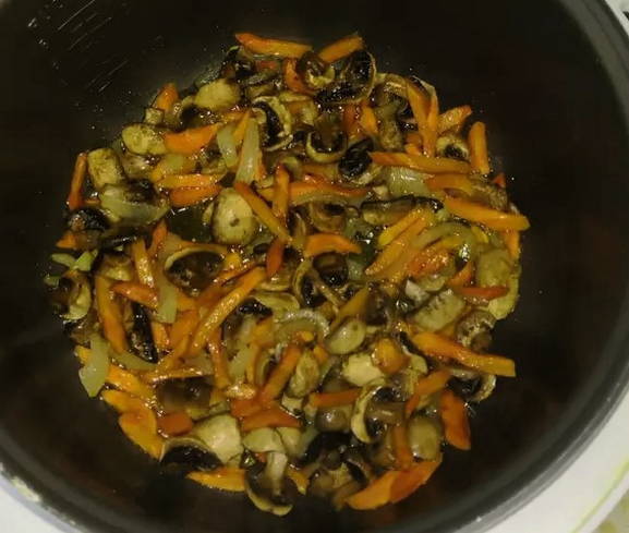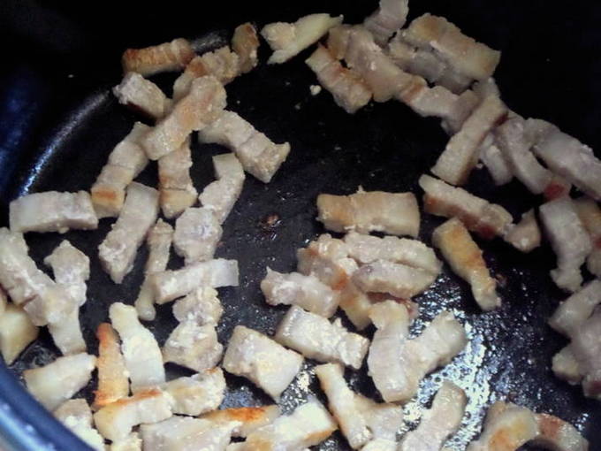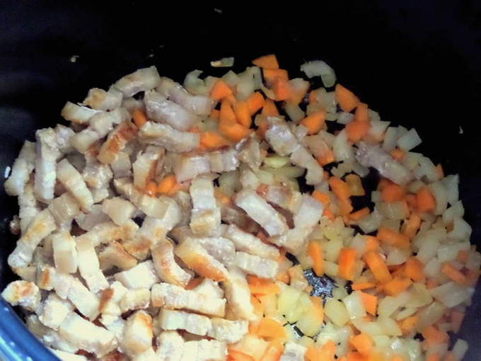 - We selecteren de modus "Brown" in een multicooker en bakken het vlees zonder olie.