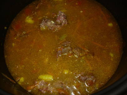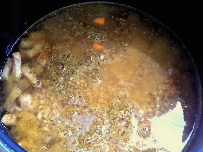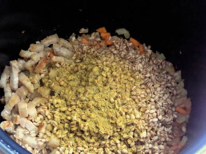 - We laten het water uit de gerst lopen en doen de granen bij de groenten in een slowcooker. Vul met schoon water.