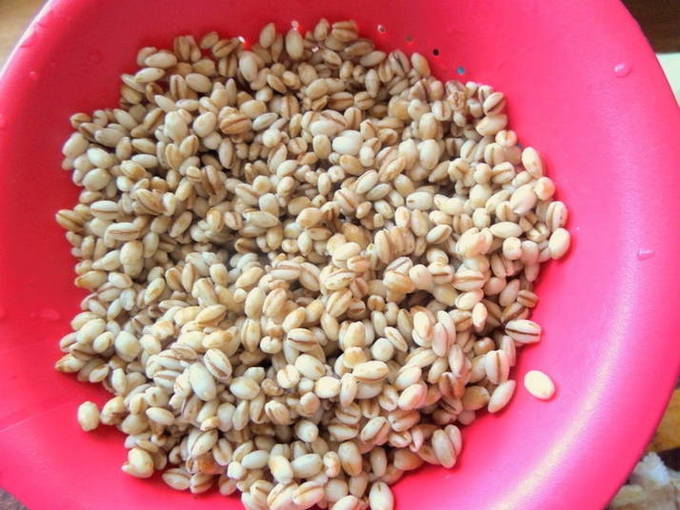 - Daarna laten we de vloeistof weglopen en spoelen we de gerst af met stromend water.