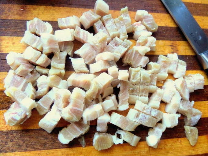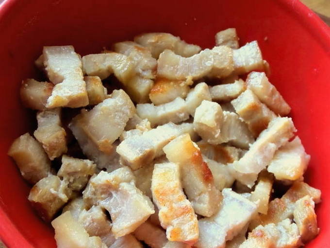 - Snijd het varkensvlees in kleine blokjes.