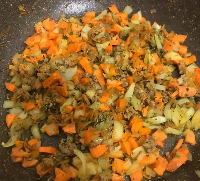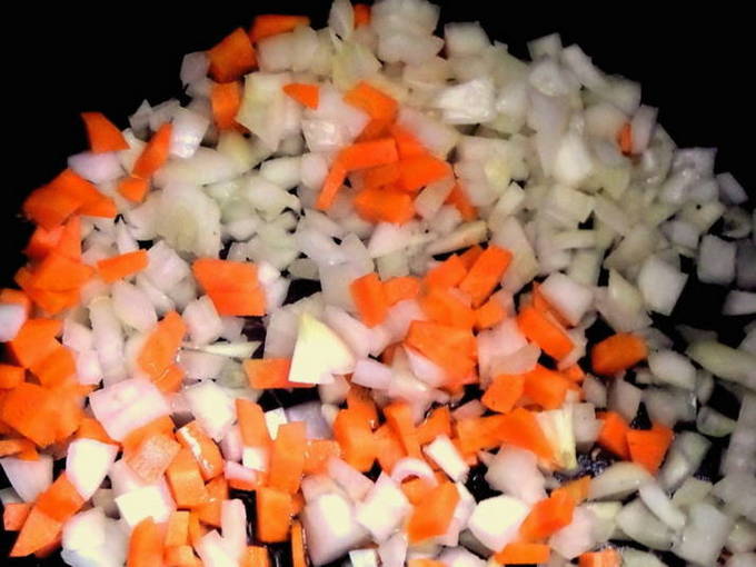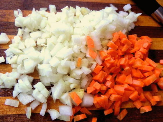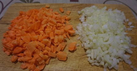 - Schil de wortelen en uien en hak ze fijn.