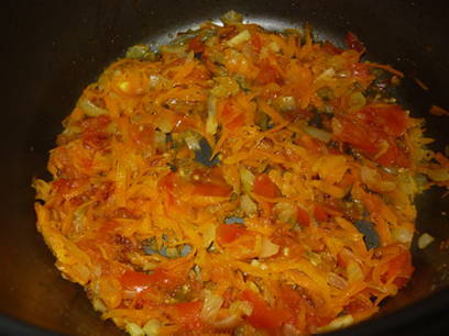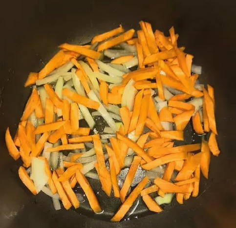 - Schil de wortelen en rasp ze op een grove rasp, voeg ze dan toe aan de uien in een slowcooker en bak nog 2 minuten.