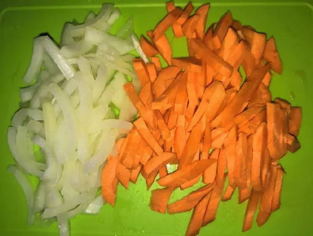 - Was uien en wortelen, schil en snij in reepjes.