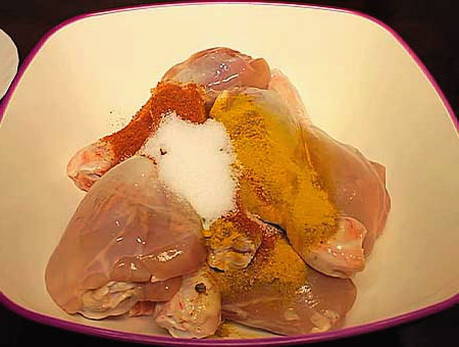 - We wassen de kip, drogen hem en mengen hem met kruiden en zout, waarna we hem ook een uur laten staan.