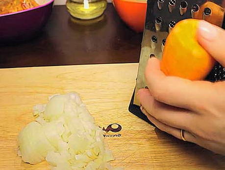 - Snipper de ui met een mes en wrijf de wortelen op een grove rasp.