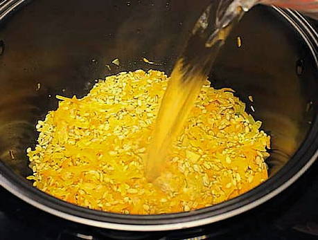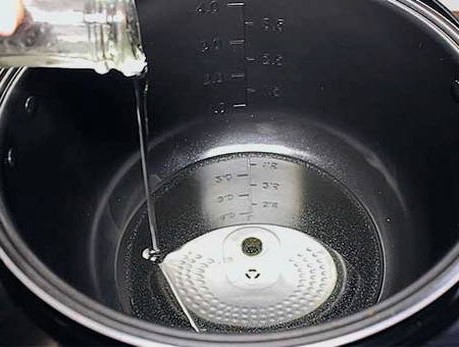 - Giet kokend water in de multicookerkom.