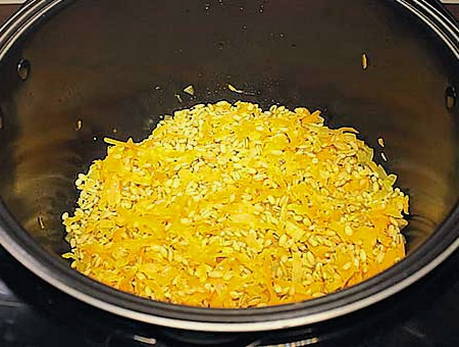 - Na 6 minuten zijn de groenten klaar. We zeven het overtollige water van de gerst en sturen het naar de groenten in de multicooker. Zout naar smaak en roer.
