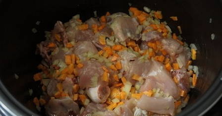 - Giet plantaardige olie in de multikoker, leg de kip erin. Dek af met een deksel en selecteer een uur lang de modus "Blussen". Voeg na 3 minuten de ui en wortel toe aan de multikoker.