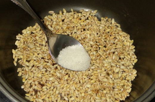 Vervolgens schuiven we het graan in de multicooker-kom en voegen zout naar smaak toe.