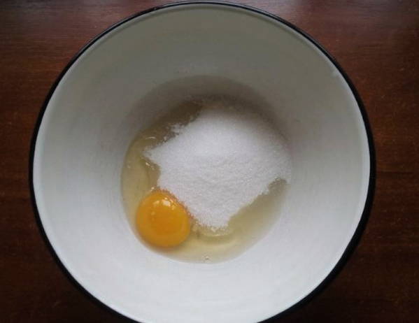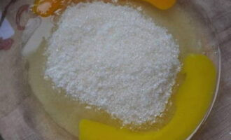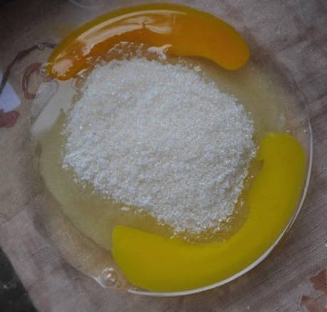 - Breek de eieren in een diepe kom en voeg suiker toe. Klop tot het droge ingrediënt is opgelost en er schuim ontstaat.