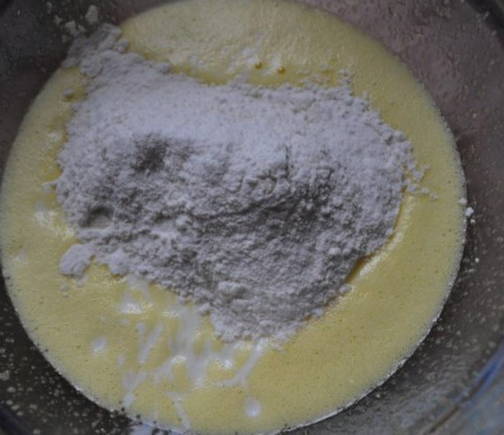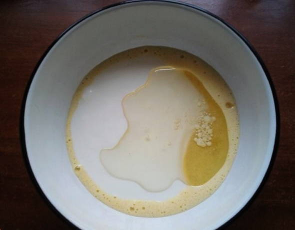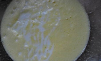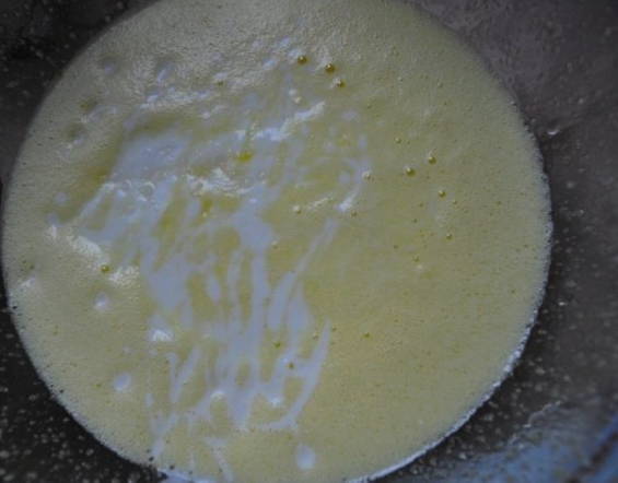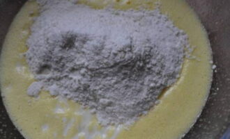 - Giet kefir bij het eiermengsel. Roer de massa.