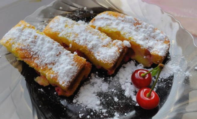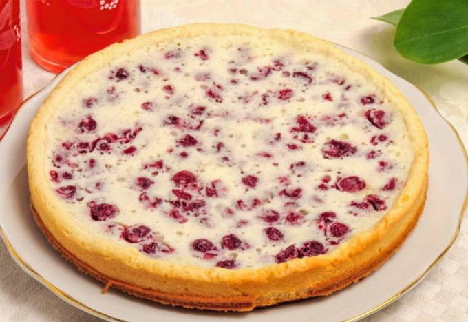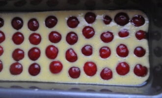 - Verdeel de kersen gelijkmatig over het oppervlak van het deeg.We bakken het gerecht 40 minuten op een temperatuur van 180-200 graden.
