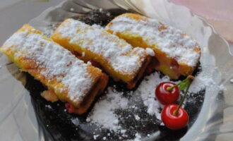 We halen de hete cake uit de vorm. We versieren het dessert met poedersuiker, verdelen het in porties en serveren.