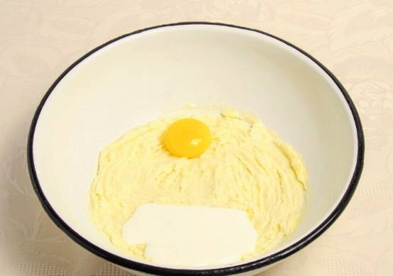 - Voor het gieten, combineer eieren, zure room, zetmeel en vanilline. Klop de massa.