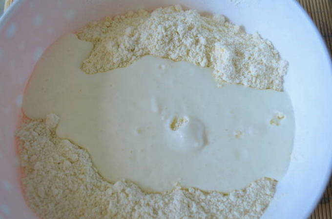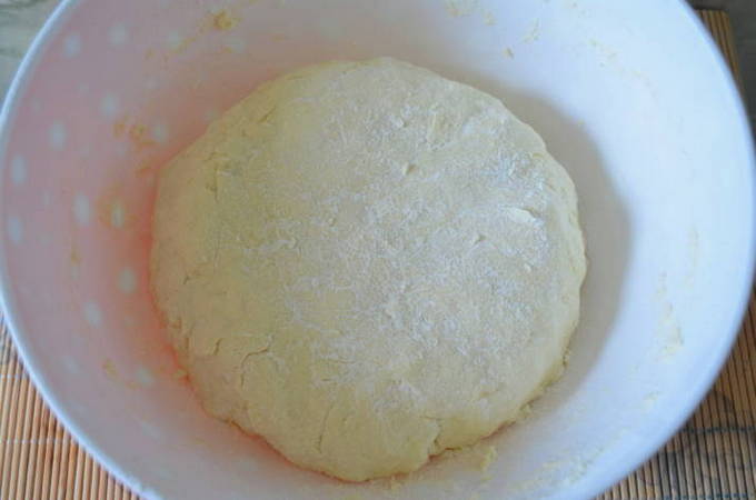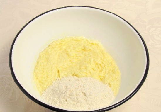 Zeef vervolgens de bloem door een zeef samen met een bakpoeder. We beginnen het deeg ijverig te kneden tot het glad is.