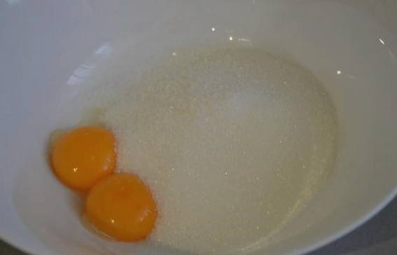 Dompel de eieren samen met de suiker in een diepe kom. Klop de producten met een garde tot een weelderig schuim ontstaat.