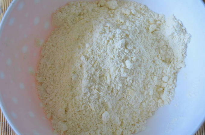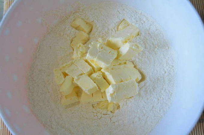 - Meng in een diep bord de gezeefde bloem met bakpoeder en een snufje zout. Leg hier stukjes zachte boter op.