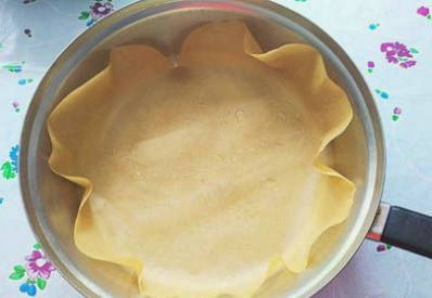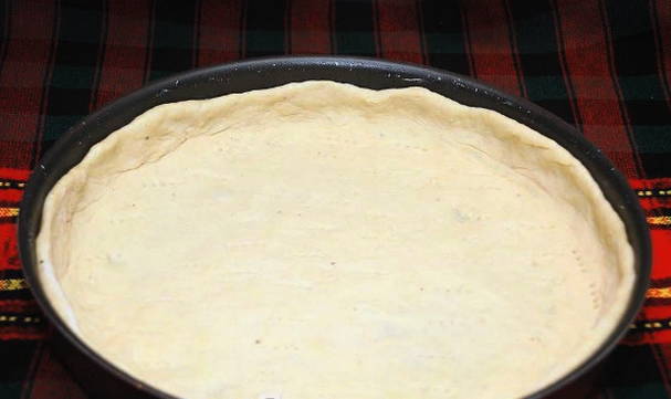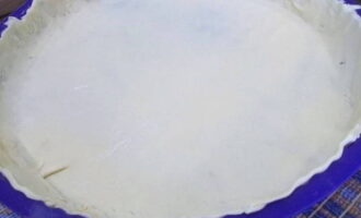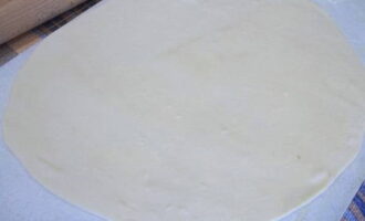 Ontdooi het bladerdeeg vooraf. Scheid een klein stukje van het product voor decoratie. Rol de rest op tot een dunne ronde laag. We gebruiken bloem om te voorkomen dat het deeg gaat plakken.