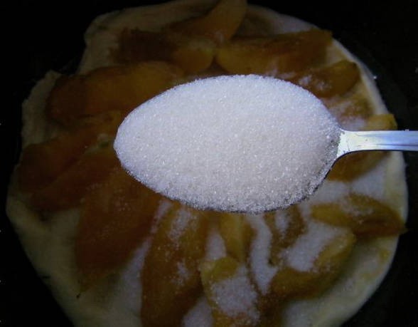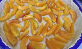 Snijd de abrikozen in dunne plakjes. Doe het product in een vorm met deeg. Bestrooi de vulling met suiker.