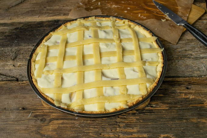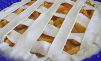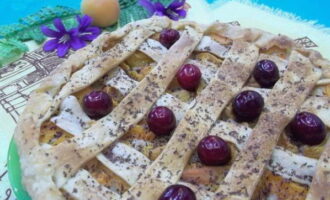 Rol het resterende deeg uit en verdeel het in dunne reepjes. We bedekken of een taart met een vulling. We sturen het dessert gedurende 25 minuten naar een voorverwarmde oven op 200 graden.