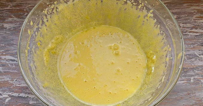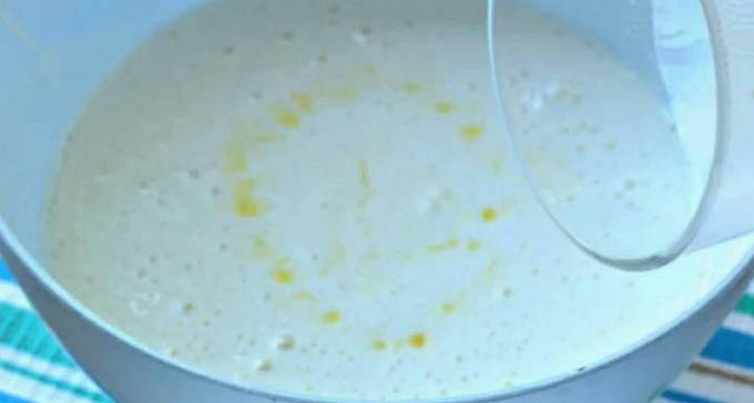 - Giet kefir bij het eiermengsel. We sturen hier ook gesmolten boter en frisdrank. Roer de inhoud.