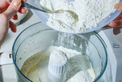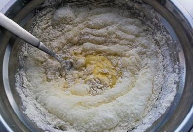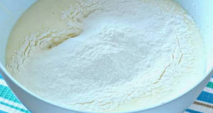 - Bloem zeven met bakpoeder. We doen hier ook een ei, zuurdesem van gefermenteerde melk, rietsuiker en de helft van het gebruikelijke. We beginnen de producten te kneden.