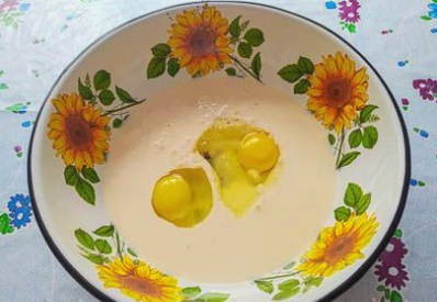 - Giet kefir in een diepe kom. We breken er kippeneieren in.