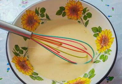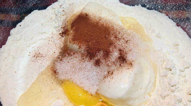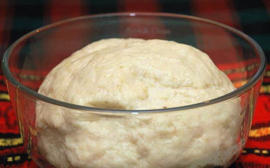 - Klop de eieren los met een lepel suiker en zure room. We sturen hier ook meel en droge gist naar toe. Kneed de producten tot er een dichte klont ontstaat. We laten het 1 uur op een warme plaats staan.