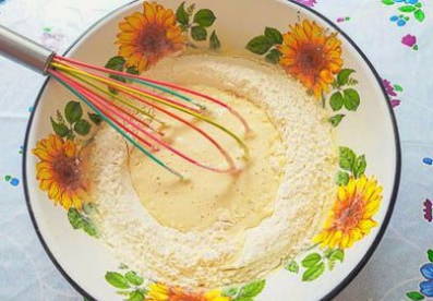 - Voeg dan bloem met bakpoeder toe. Blijf kloppen tot het glad is.