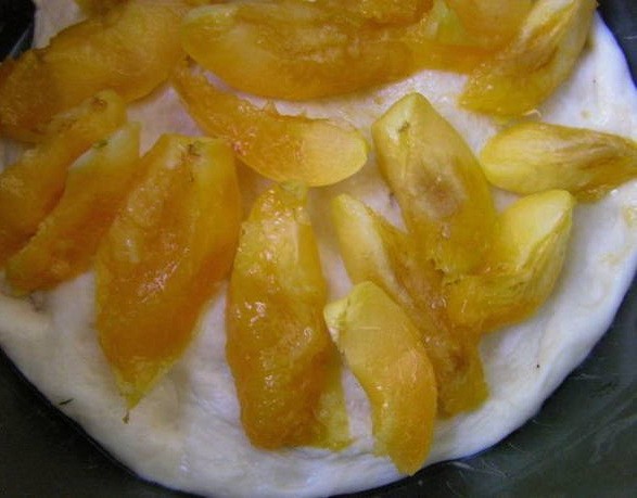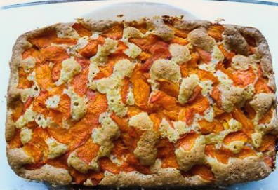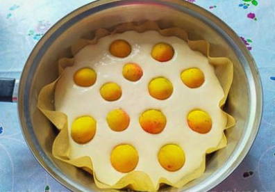 - Verdeel de abrikozenplakjes gelijkmatig over het deeg.